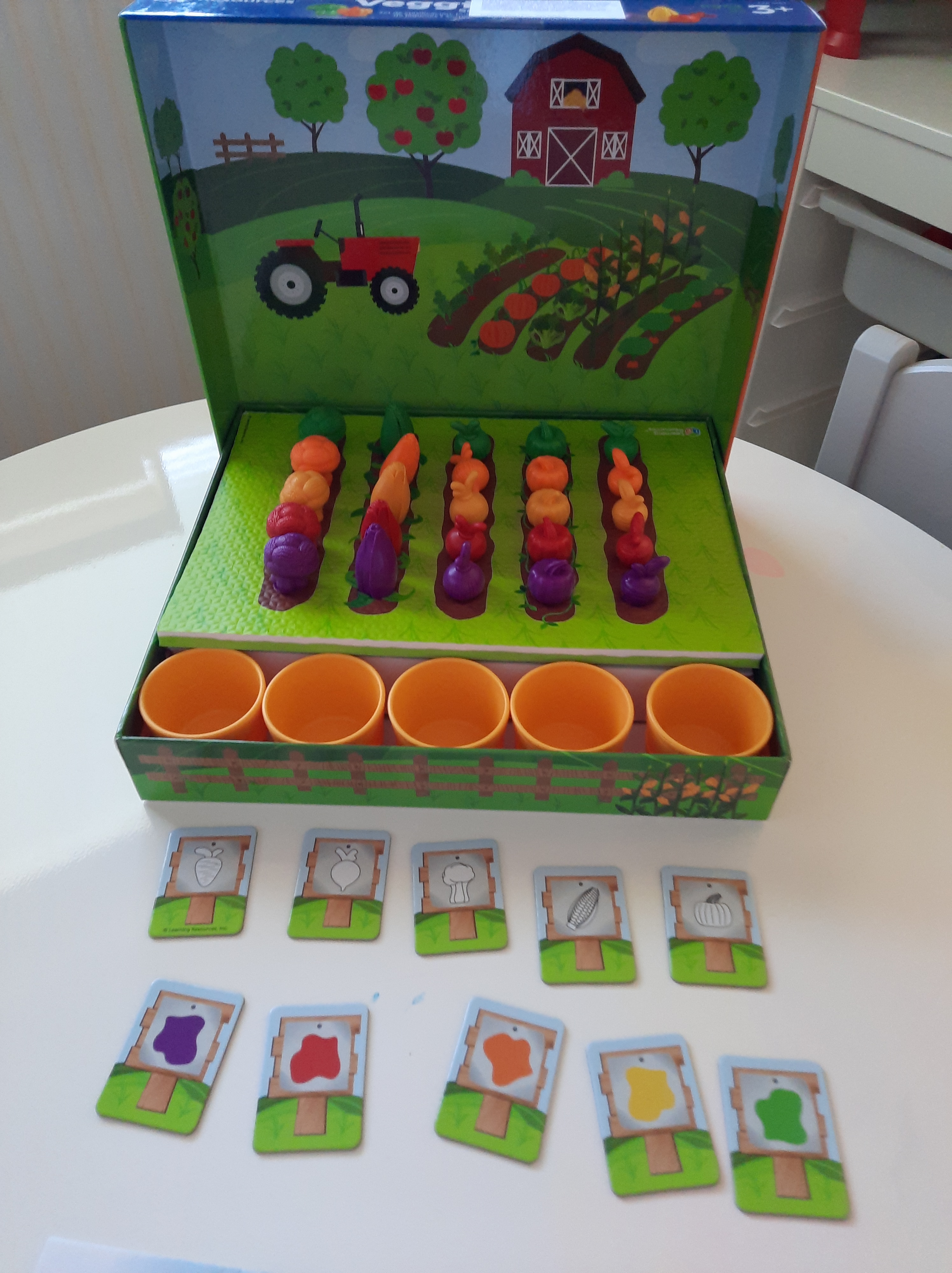 Prvi način učenja barv je družabna igra. Pri nas je najbolj popularna tale igra: LR set za razvrščanje zelenjavni vrt, ki pri nas raztura. Imamo jo že kar nekaj časa in še vedno je aktualna, praktično skoraj na dnevni ravni. Igra naj bi bila za otroke starejše od treh let, pri nas je popularna že prej. Poleg učenja 5 bolj zemeljskih barv, se otrok lahko uči še štetja in razvrščanja. Kupila sem jo v spletni trgovini KAKADU in stane 29.99€. Definitivno je vredna nakupa in tudi morda dobra ideja za darilo.
