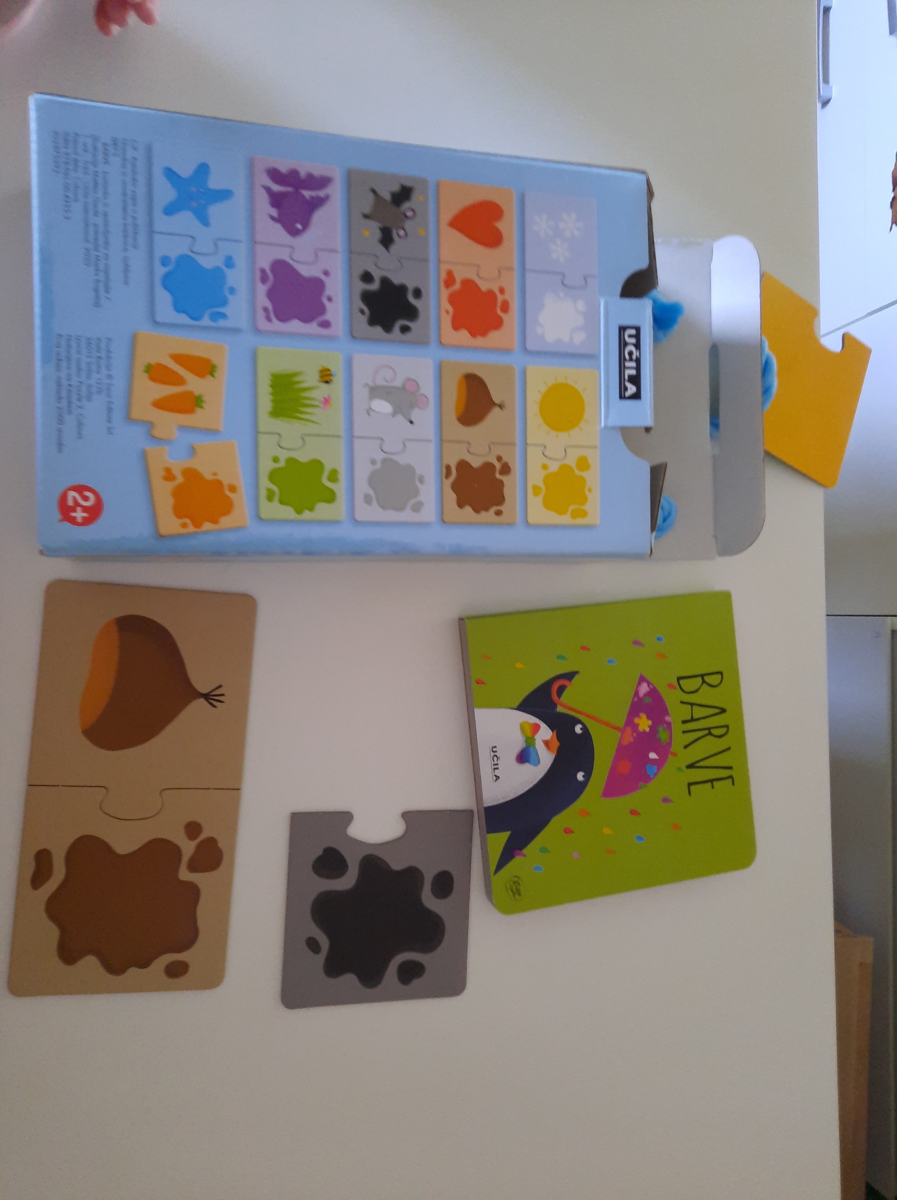 Drugi način učenja je sestavljanka. Mi imamo najrajši sestavljanko BARVE od UČILE. Sestavljanka se enostavna in iz 2 delov. Skupaj sestaviš barvo in predmet take barve. Skupno obsega 20 kosov kar pomeni 10 osnovnih barv. Primerna za dve leti in naprej, lahko tudi prej, če malčki že sestavljajo. Priložena je tudi knjigica. Kupila sem jo v KNJIGARNI FELIX in stane 12.99€. Še ena super stvar, za katero nam ni žal €€€.