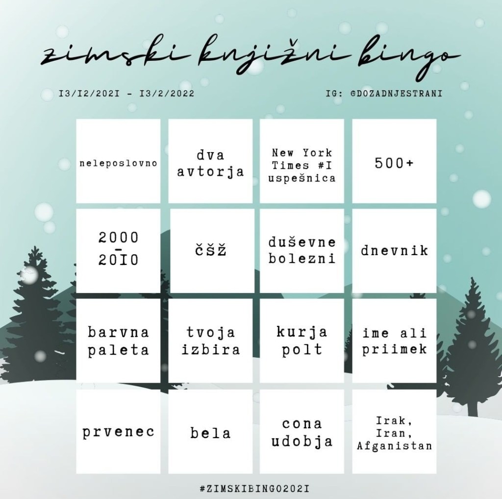 Že leta imam v glavi nek skrivni seznam, kamor se nabirajo željene knjige za branje. In končno so prišle na vrsti z ZIMSKIM BINGOM 2021, ki ga organizira Sandra (IG/Goodreads: Dozadnjestrani). #zimskibingo2021 zasledila sme ga na Instagramu in ravno v pravem času, saj je s cilji vse lažje. In tole bo pravi izziv za začetek in sprostitev.